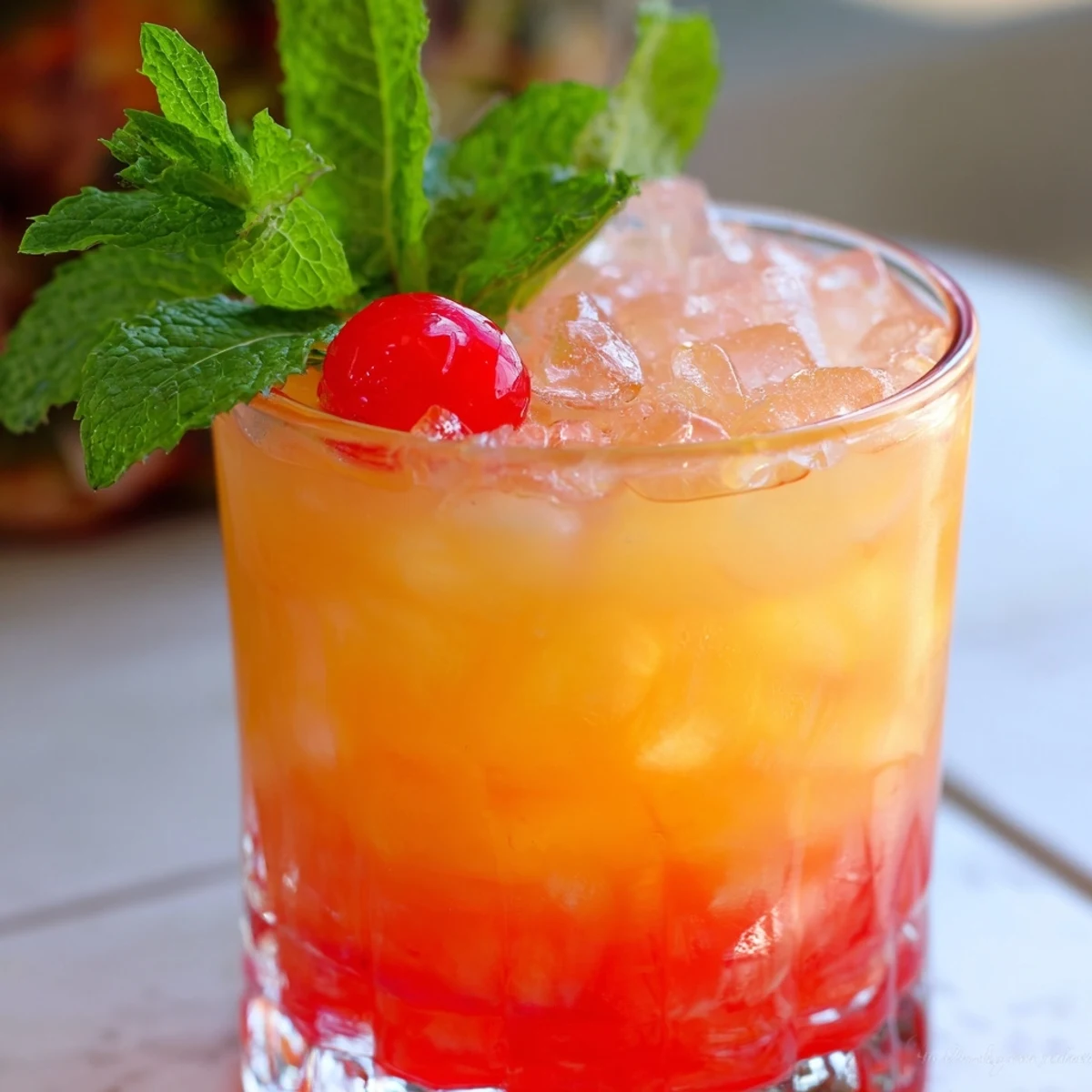 This alcohol-free twist on the classic tiki favorite combines fresh orange, pineapple, and lime juices with creamy orgeat syrup. The grenadine creates a beautiful sunset gradient in the glass, while mint and cherry garnishes add authentic island flair. Perfect for summer gatherings or whenever tropical vibes are needed, this mocktail delivers all the complex flavors of the original without the buzz.